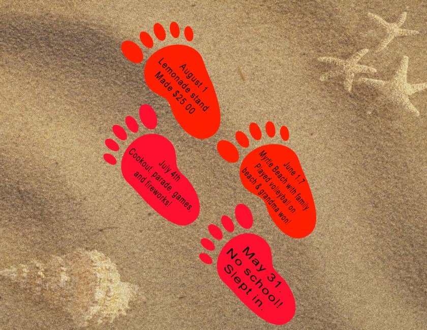 3. Now, when you go somewhere on vacation, do something fun, spend time with your family, or friends…write about it on each foot print.  Be sure to put the date.  Younger kids can draw pictures about their adventures. Or take pictures with your camera or phone.
