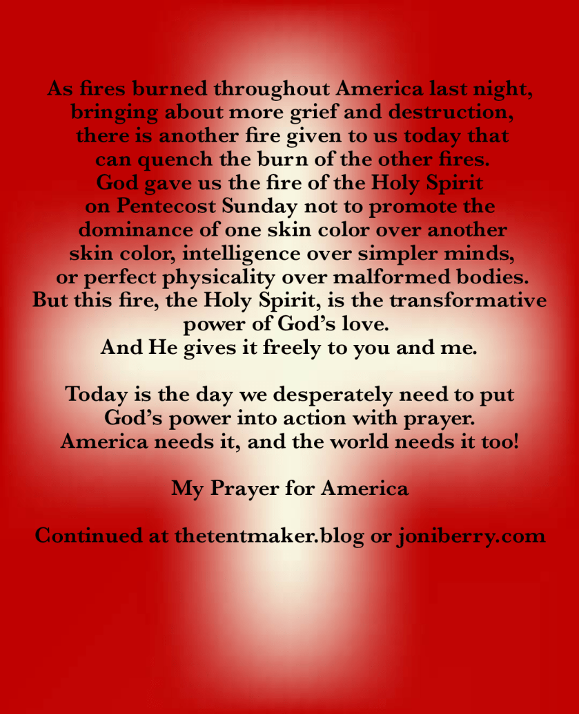 As fires burned throughout America last night, bringing about more grief and destruction, there is another fire given to us today that can quench the burn of the other fires. God gave us the fire of the Holy Spirit on Pentecost Sunday not to promote the dominance of one skin color over another skin color, intelligence over simpler minds, or perfect physicality over malformed bodies. But this fire, the Holy Spirit, is the transformative power of God’s love. And He gives it freely to you and me.