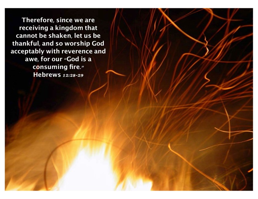 “Therefore, since we are receiving a kingdom that cannot be shaken, let us be thankful, and so worship God acceptably with reverence and awe, for our  “God is a consuming fire.”